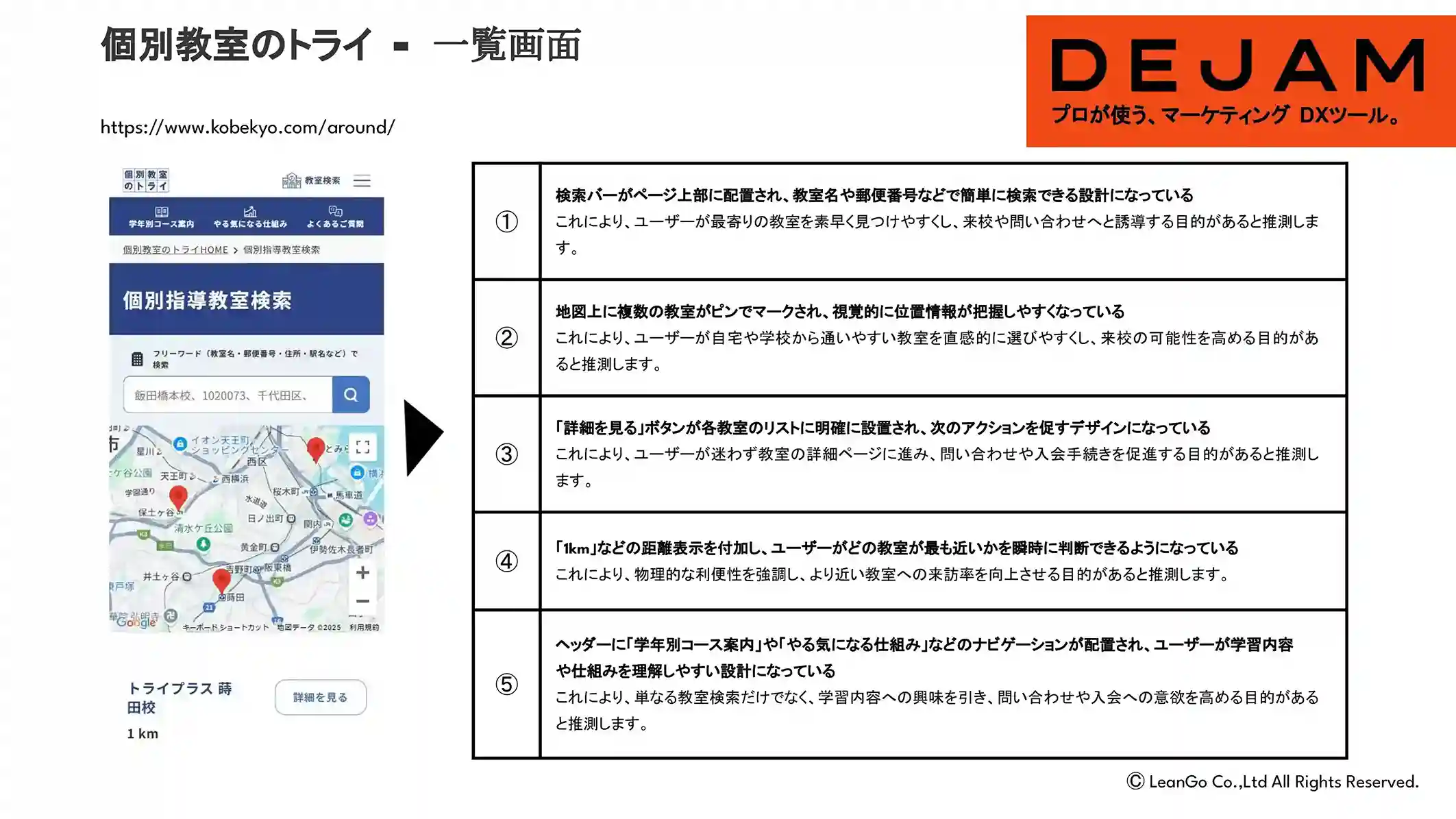 - これにより、ユーザーが最寄りの教室を素早く見つけやすくし、来校や問い合わせへと誘導する目的があると推測します。