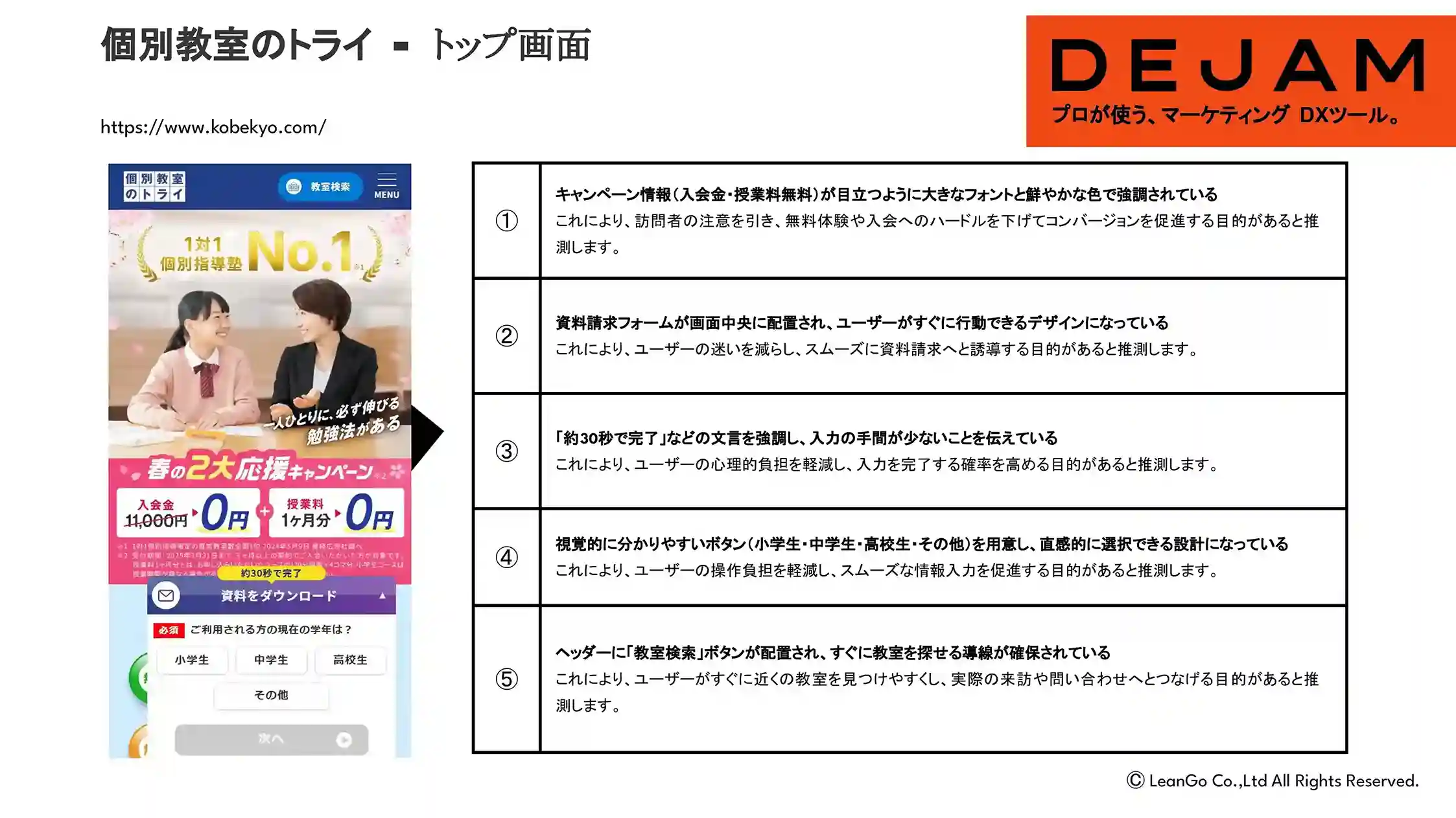 - これにより、訪問者の注意を引き、無料体験や入会へのハードルを下げてコンバージョンを促進する目的があると推測します。