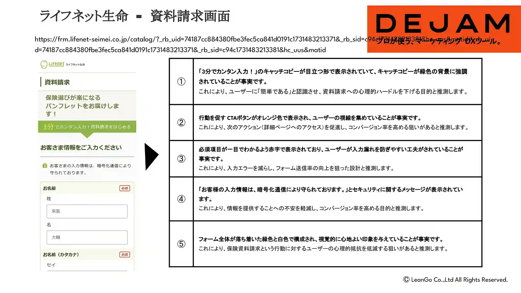 - これにより、ユーザーに「簡単である」と認識させ、資料請求への心理的ハードルを下げる目的と推測します。