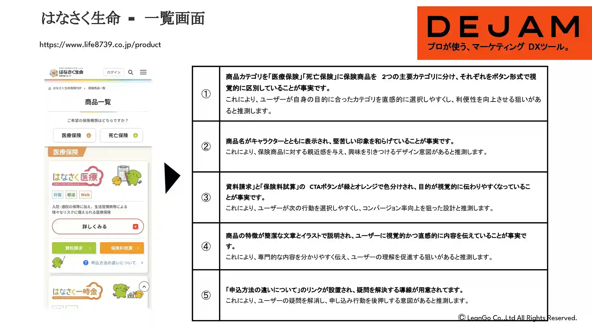 - 商品カテゴリを「医療保険」「死亡保険」に保険商品を2つの主要カテゴリに分け、それぞれをボタン形式で視覚的に区別していることが事実です。