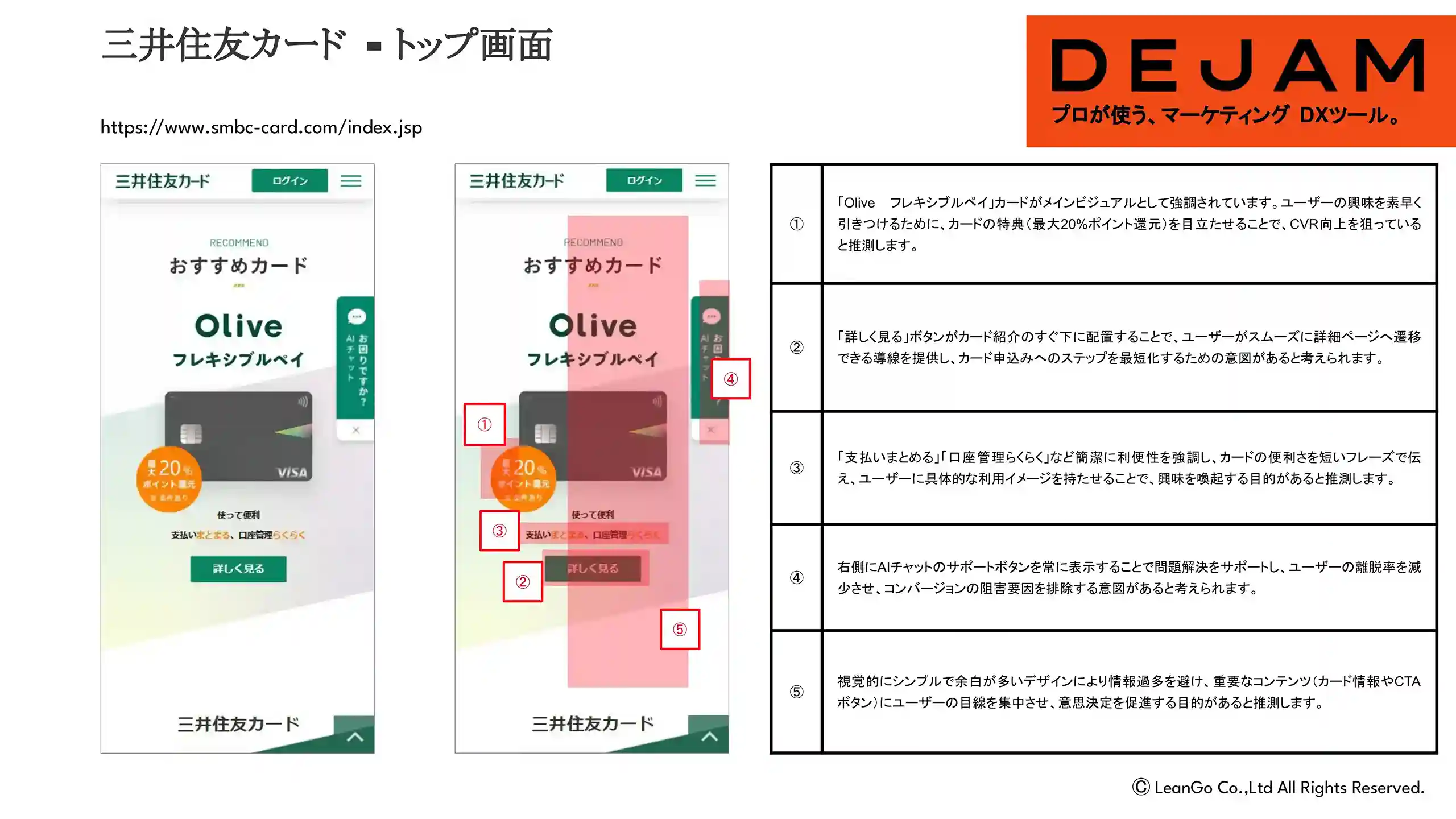 - ユーザーの興味を素早く引きつけるために、カードの特典(最大20%ポイント還元)を目立たせることで、CVR向上を狙っていると推測します。