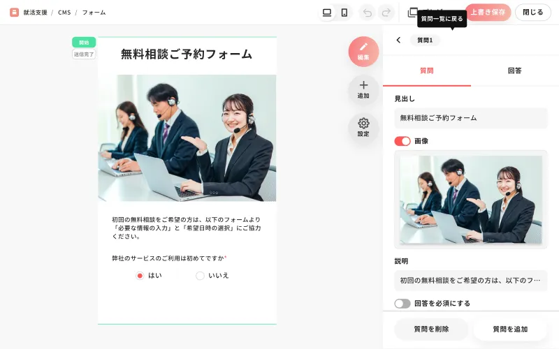 質問項目と回答項目をノーコードで選べる。フォーム作成に欠かせない要素を豊富にご用意。画像やテキストを自由にカスタマイズすることもできるので、高品質なフォームを手軽に作成できます。