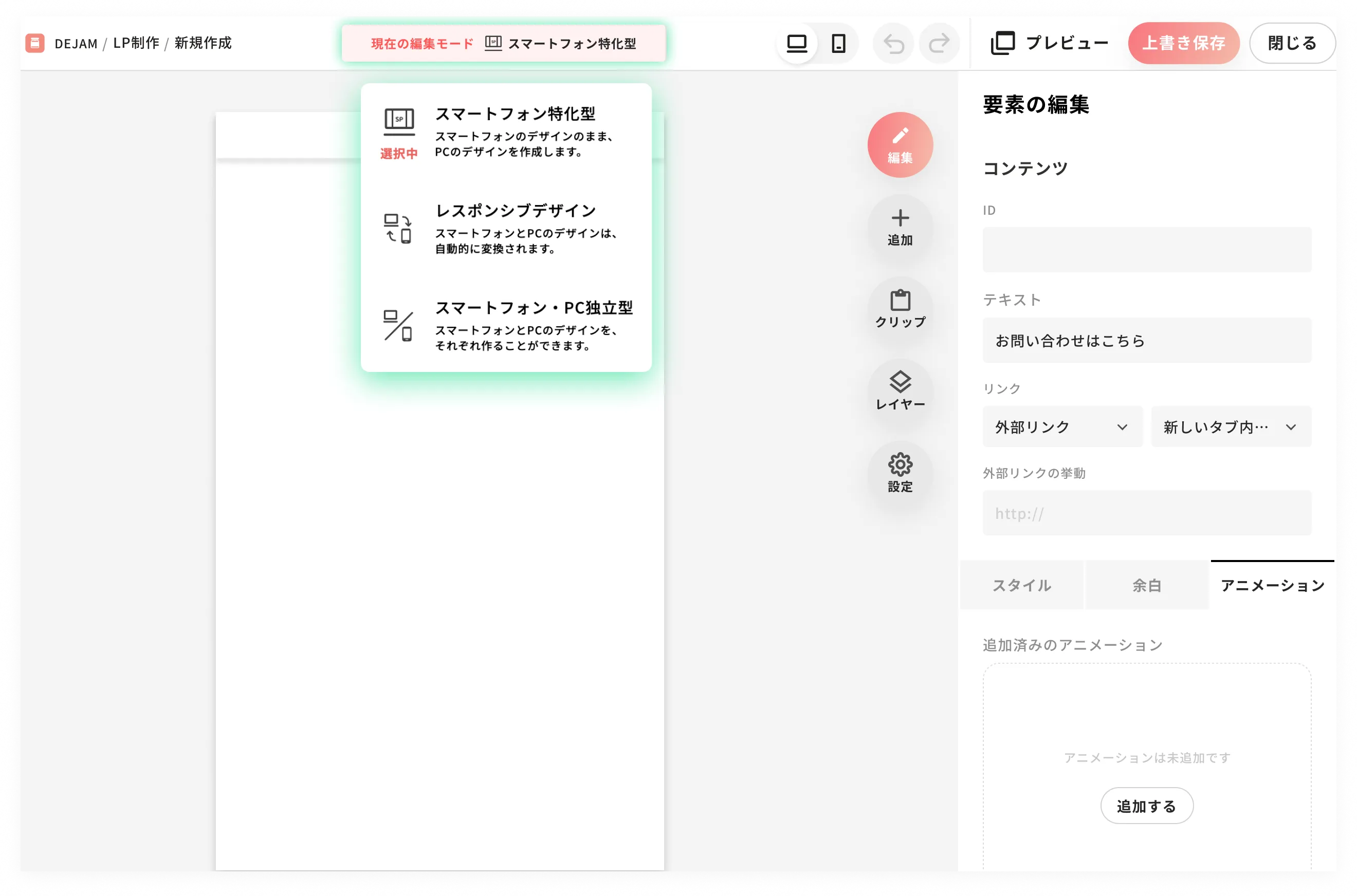 今回のアップデートで、LP制作機能で作成できるLPを「レスポンシブ型」「デバイス独立型」「スマートフォン特化型」と、用途にあわせて作り分けることができるようになりました。