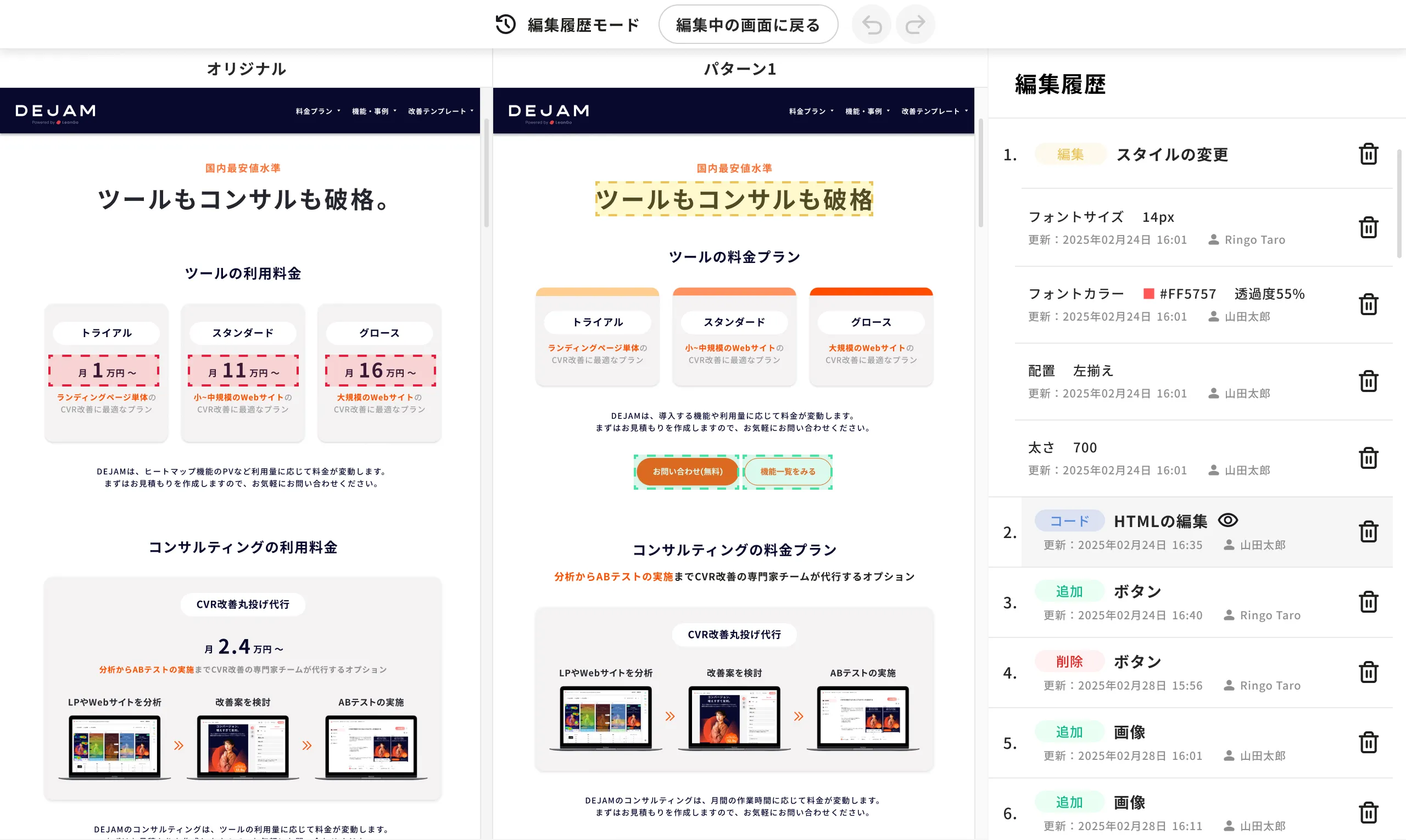 株式会社LeanGo(本社:東京都目黒区、代表取締役:平井翔吏)が提供するマーケティングサクセスツール「DEJAM(デジャム)」は、ABテスト機能において「編集履歴表示機能」を新たに実装しました。本機能により、誰が・いつ・どのような編集を行ったかを一覧で可視化でき、チーム内の作業透明性を高めながら、施策のスピードと精度を同時に向上させることが可能になります。