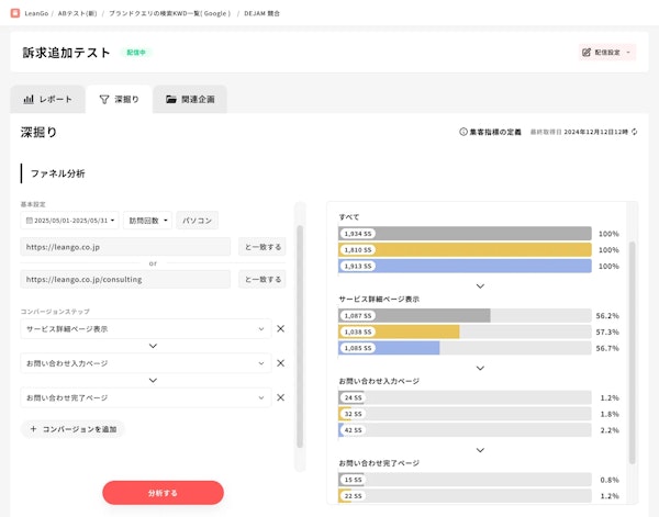 株式会社LeanGo(本社:東京都目黒区、代表取締役:平井翔吏)が提供する CVR改善ツール「Dejam(デジャム)」 は、既存のコンバージョン情報を使ってマイクロCV(中間コンバージョン)を分析できるファネル分析機能」を新たに実装しました。本機能により、ユーザー行動を段階的に可視化でき、最終コンバージョンに至るまでの離脱要因をより正確に分析することが可能になります。