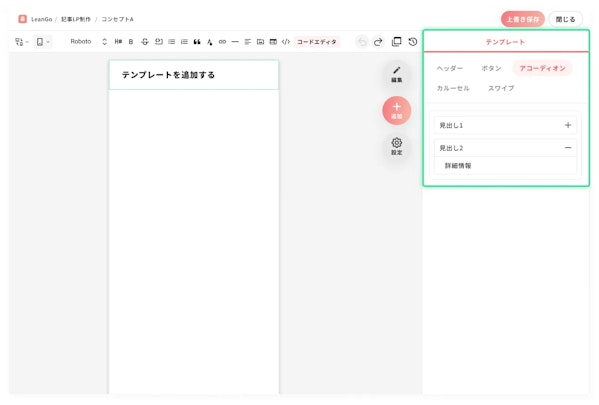 今回のアップデートでは、LP制作機能内に「アコーディオン」テンプレートを追加。クリックひとつで折りたたみブロックを挿入できるようになり、テキスト情報の整理やUX改善がよりスムーズに行えます。