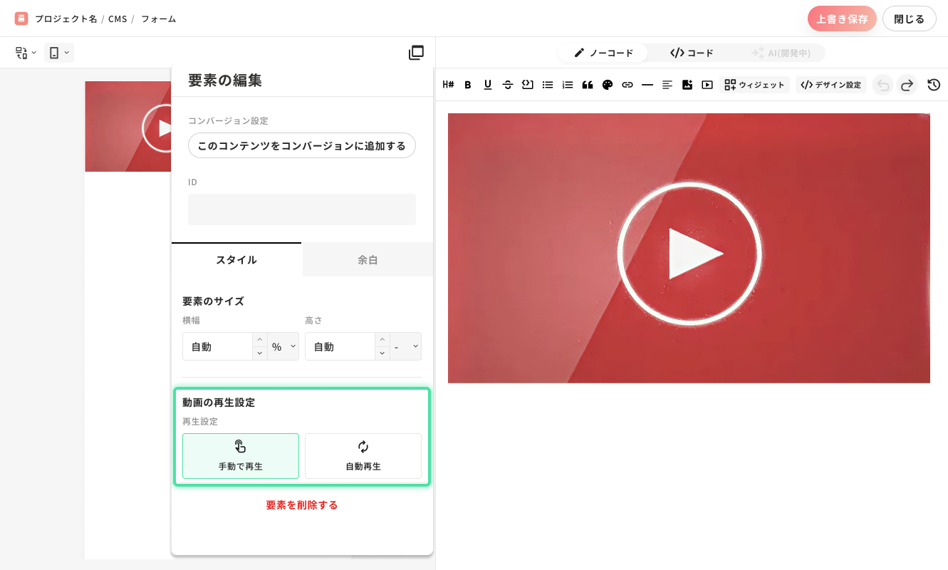 手動再生モード: ユーザーが再生ボタンをクリックすることで動画が始まります。音声付きのインタビュー動画や、じっくり視聴してほしい解説動画に適しています。