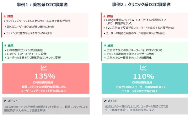 今回の提携は、当社が長年培ってきた顧客データや運用ノウハウと、LeanGoが提供する「Dejam」の「LP制作・ABテスト・ヒートマップ分析」機能およびコンサルティング支援を掛け合わせることにより、短期間での効果検証とデータに基づく成果改善を実現するものです。特に、広告運用とLPOの両輪によってCPA改善・LTV向上を推進し、クライアントの持続的な成長加速につなげます。