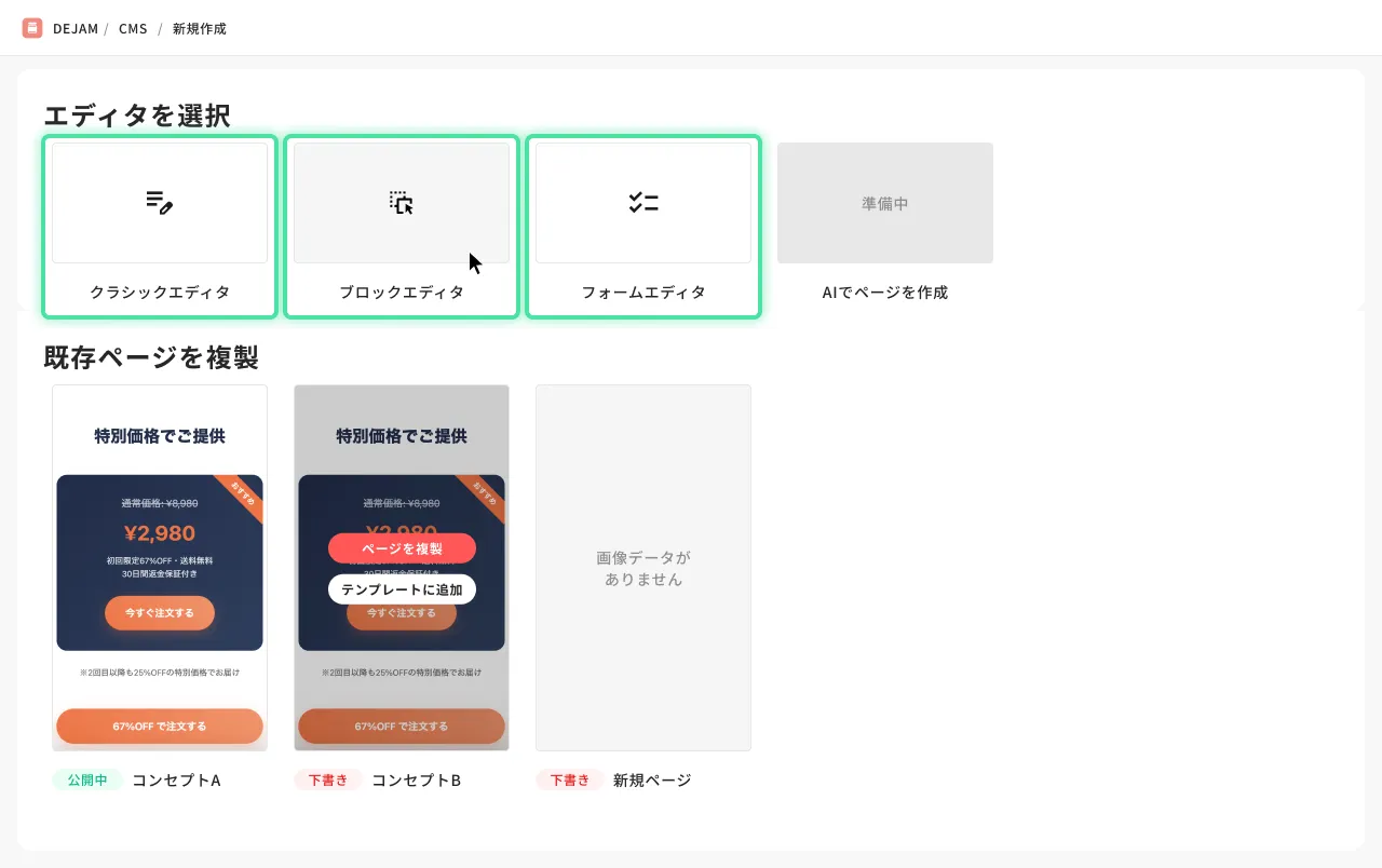 そこでDEJAMでは、異なるニーズに対応できる3種のエディタをそれぞれ搭載し、あらゆる制作現場の課題解決に対応しました。