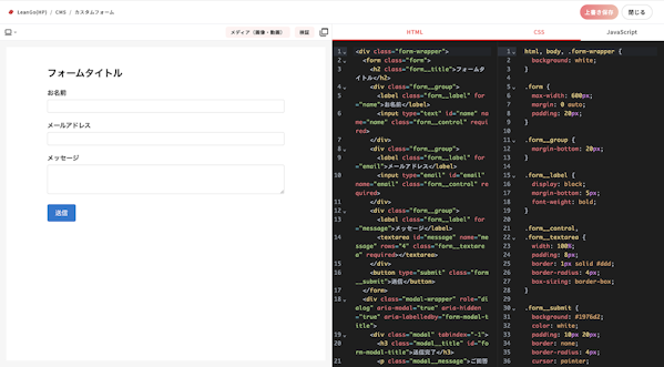 今回のアップデートでは、CMSのフォーム編集画面に HTML・CSS・JavaScript へフルアクセスできるコードエディタ を搭載。ユーザー自身がカスタムコードを書き、自由にフォーム仕様を作れるようになりました。