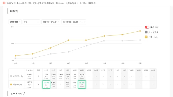 今回のアップデートでは、勝っているパターンのCVRに色をつけることで、重要な情報を直感的に認識できるよう改善しました。